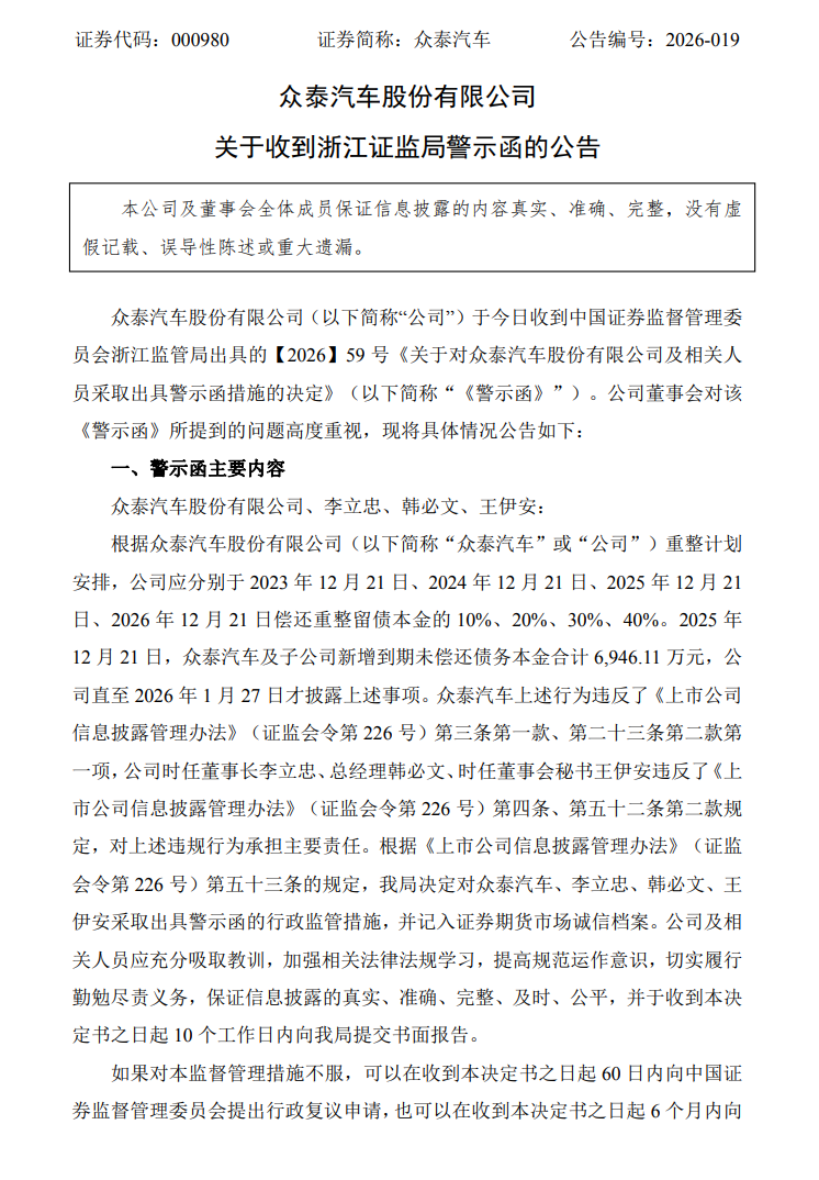 根据警示函内容显示,众泰汽车及相关人员被采取监管措施的具体原因为:根据公司重整计划安排,公司应分别于2023年12月21日、2024年12月21日、2025年12月21日、2026年12月21日偿还重整留债本金的10%、20%、30%、40%。其中,2025年12月21日,众泰汽车及子公司新增到期未偿还债务本金合计6,946.11万元,但公司直至2026年1月27日才披露上述事项。
