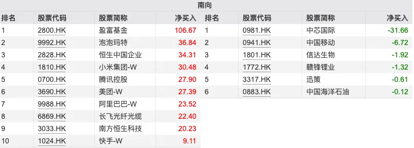 大幅净买入:泡泡玛特(09992.HK)4.57亿港元;美团-W(03690.HK)3.41亿港元;长飞光纤光缆(06869.HK)2.27亿港元。