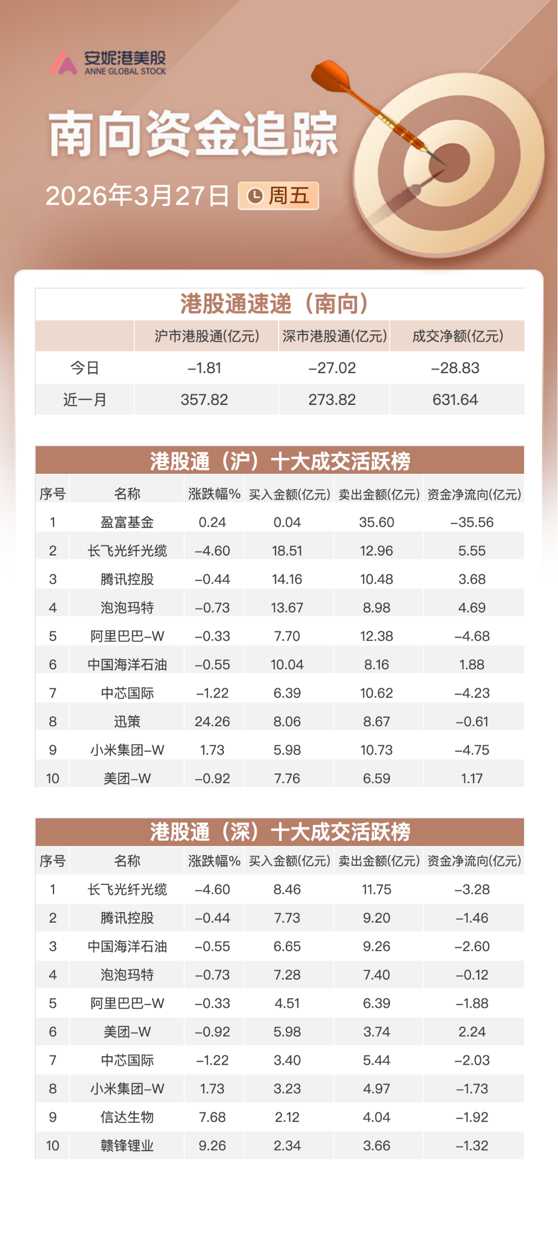 周五,南向资金净流出约28.83亿港元,其中沪港股通净流出约1.81亿港元,深港股通净流出约27.02亿港元。