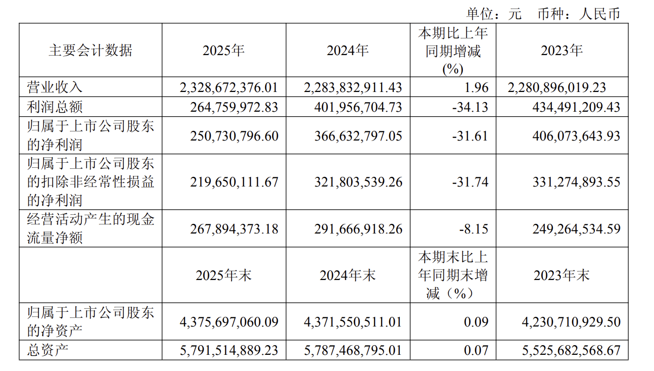 年报数据显示,2025年,海尔生物实现营收23.29亿元,同比增长1.96%,归母净利润为2.51亿元,相比2024年的3.67亿元同比大幅下滑31.61%,扣非净利润为2.20亿元,同比下滑31.74%。