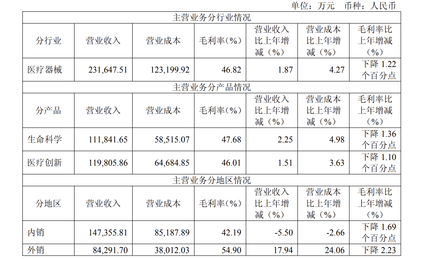 目前,海尔生物主营业务由生命科学与医疗创新两大板块构成。2025年,该两大业务分别实现营收11.18亿元和11.98亿元,同比分别增长2.25%和1.51%,但对应毛利率分别下滑了1.36个百分点和1.10个百分点。