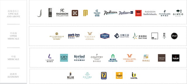 锦江酒店构建了全面的品牌矩阵,涵盖经济型、中端、中高端、高端及以上不同档次。高端品牌有J酒店、Radisson等;中高端品牌有锦江都城、丽柏、希尔顿欢朋等;中端品牌有麗枫酒店、维也纳酒店等;经济型品牌有锦江之星、白玉兰酒店等。