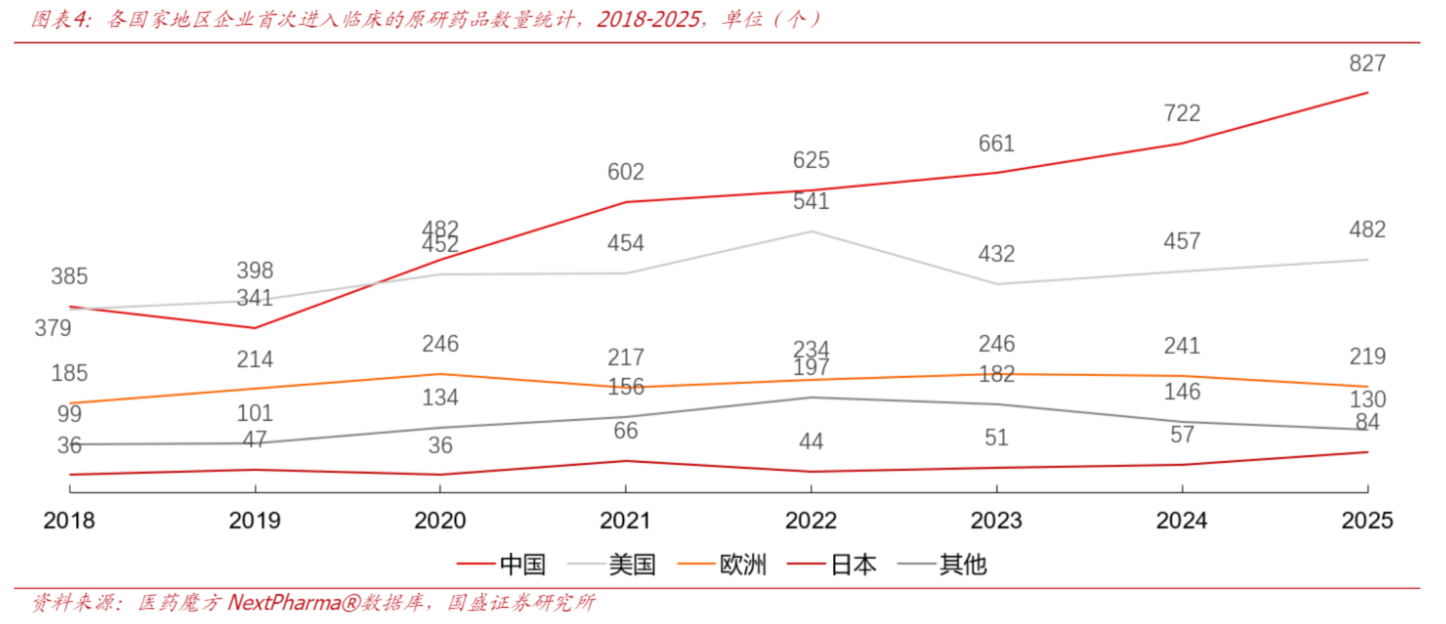 3)研发方面,临床活跃度持续提升,中国创新药研发进入高质量收获期。截至2025年末,全球在研且研发状态活跃的创新药共14088个,其中中国企业原研药品数量4751个、占比33.7%,超过美国的4019个、28.5%,位居全球第一;2018-2025年全球首次进入临床的创新药共11698个,其中中国原研产品4639个、占比40%,2025年中国有827款原研创新药首次进入临床,全球占比47.4%。