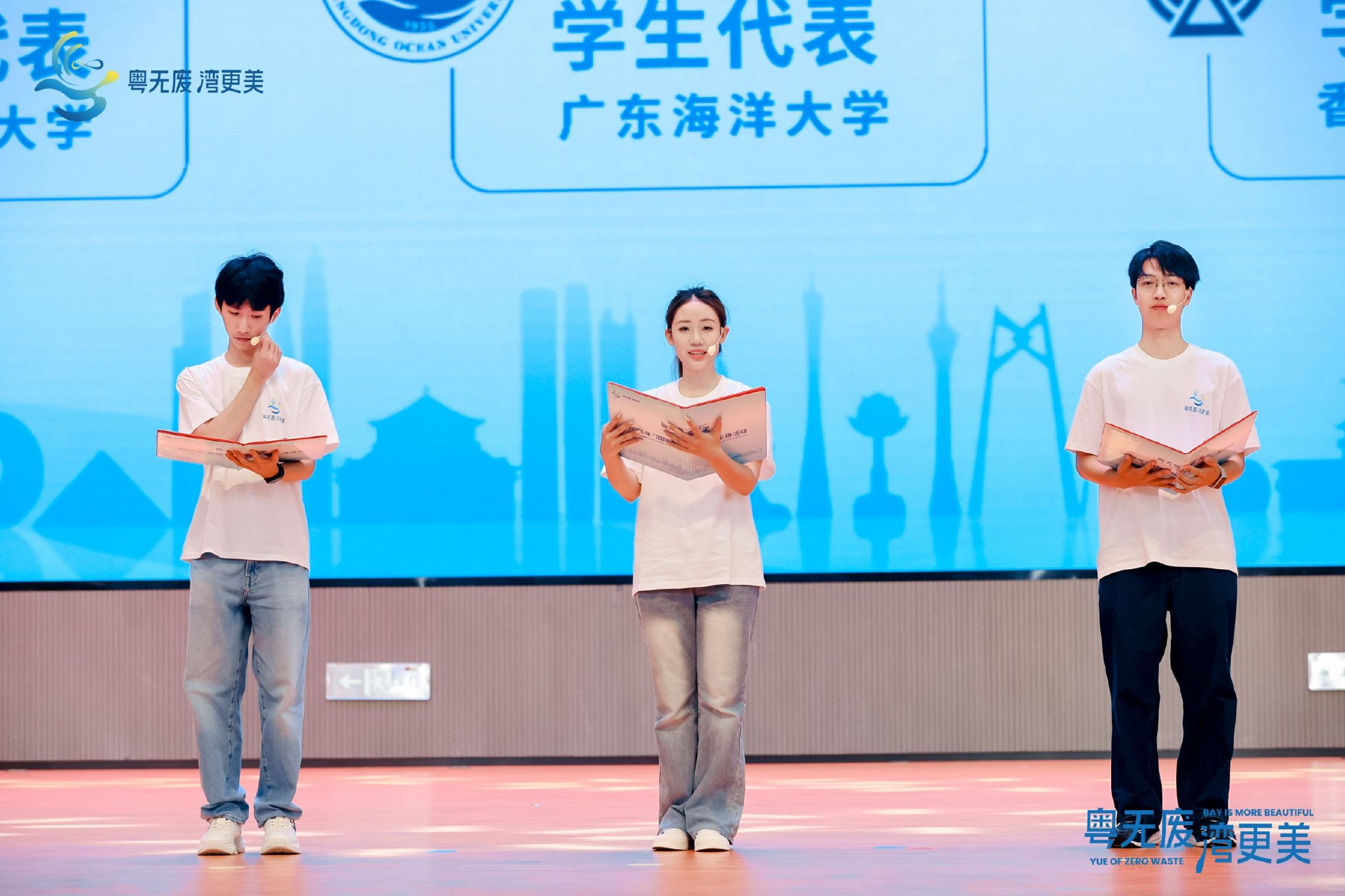 来自广东海洋大学、香港科技大学、澳门科技大学的三名同学代表粤港澳三地学子共同宣读《“粤无废·湾更美”行动倡议书》,倡议三地青年争做减量践行者、资源循环者、生态守护者、绿色传播者,为“无废湾区”建设贡献青春力量。
