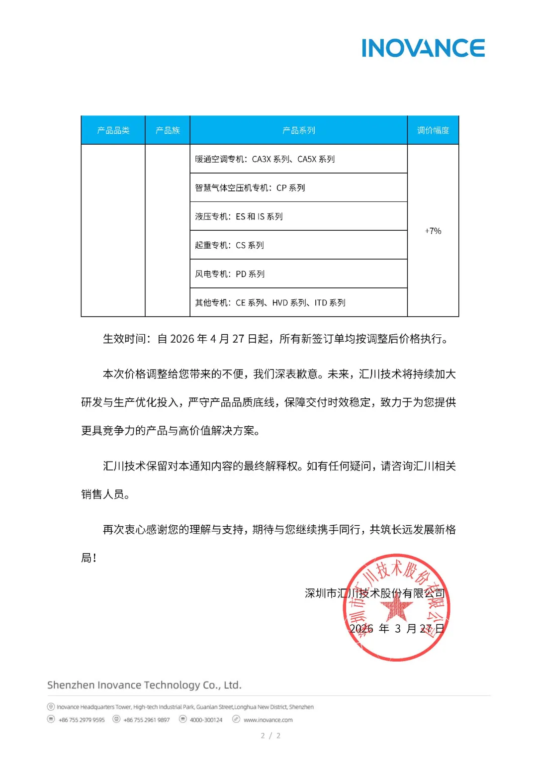 3月31日,汇川技术发布产品价格调整通知:近期,受全球市场多重因素影响,大宗商品价格波动加剧,以及其它核心原元器件价格也持续高位运行,致使公司低压变频产品生产成本大幅攀升。经公司管理层审慎研究决定,现对低压变频相关产品价格进行调整,调价幅度为5%-10%。自2026年4月27日起,所有新签订单均按调整后价格执行。