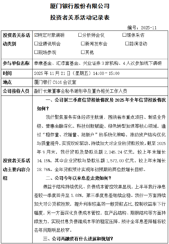 11月24日金融一线消息,厦门银行发布投资者关系活动记录表。谈及息差走势,厦门银行回应称,得益于结构持续优化、负债成本管控效果显现,上半年我行净息差较一季度回升至1.08%,第三季度息差继续企稳。我行一方面持续加大对公贷款投放,提升利率较高的一般贷款占比,控制收益率下行幅度,另一方面深化负债成本管控,在产品结构、期限结构等方面持续发力,实现付息负债端成本率的稳定压降。厦门银行进一步表示,预计全年息差降幅将较去年同期明显收窄。