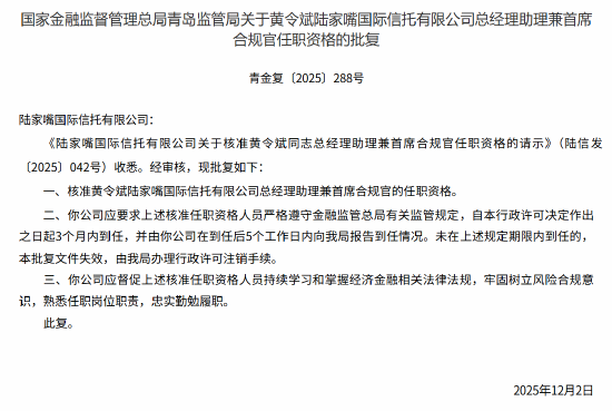 12月5日金融一线消息,国家金融监督管理总局青岛监管局发布批复,核准黄令斌