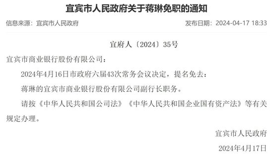 但仅仅半年之后的2024年4月,宜宾市人民政府六届43次常务会议决定,提名免去蒋琳的宜宾银行副行长职务。