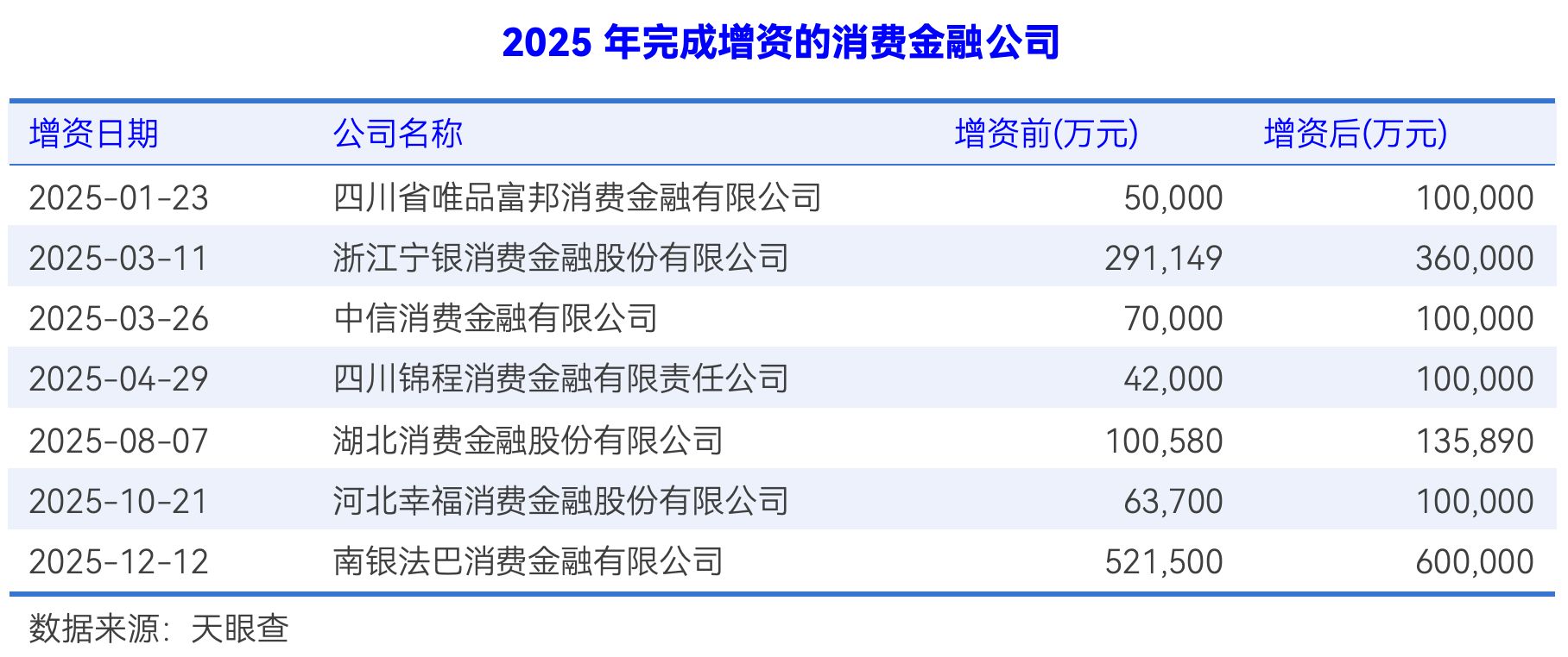 据不完全统计,今年以来,包括宁银消费金融、南银法巴消费金融等在内,至少有7家消费金融公司进行了增资。