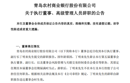 1月19日,青农商行(002958.SZ)对外公告称,公司董事会近日收到执行董事、副行长丁明来提交的辞职报告。因年龄原因,丁明来辞去公司第五届董事会执行董事、副行长,以及董事会风险管理与关联交易控制委员会委员等职务,其原定任期至本届董事会任期届满时为止。辞职后,其不在公司及公司控股子公司担任任何职务。