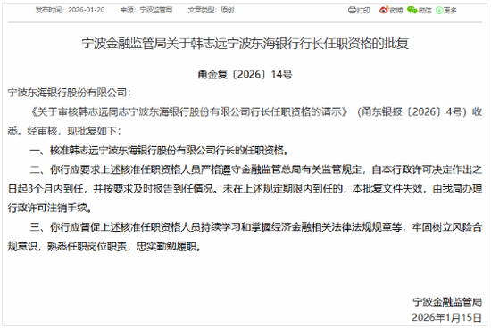 1月20日,宁波金融监管局批复显示,韩志远任宁波东海银行行长的任职资格获批。