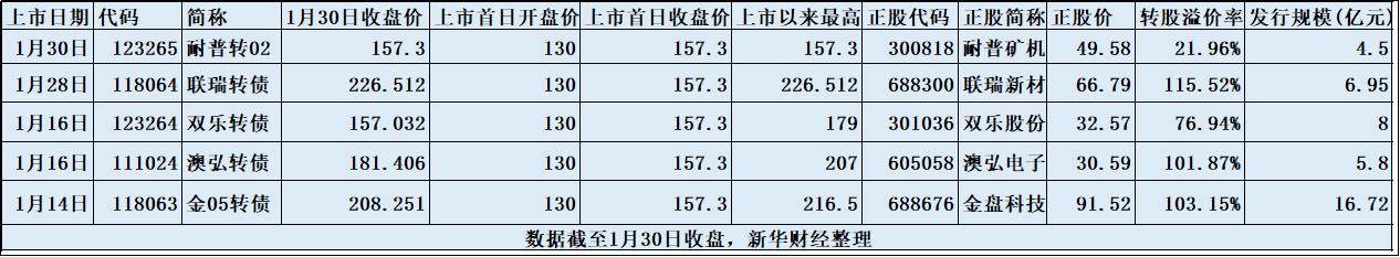 截至1月30日收盘,新券价格还全部保持在150元以上。联瑞转债堪称当月“明星券”,上市三个工作日以及实现价格轻松翻倍,1月30日单日上涨20%,收盘价226.512元。更惊人的是其成交活跃度——单日成交量149.16万手,成交额31.40亿元,换手率高达214.62%。除联瑞转债外,金05转债以208.251元位居第二,澳弘转债181.406元,耐普转02和双乐转债则在157元左右。