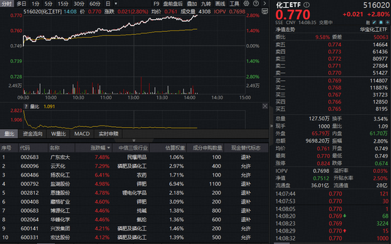 成份股方面,民爆用品、农药、锂电等板块部分个股涨幅居前。截至发稿,广东宏大、云天化双双大涨超7%,扬农化工涨超6%,盐湖股份、恩捷股份、藏格矿业等多股跟涨超4%。