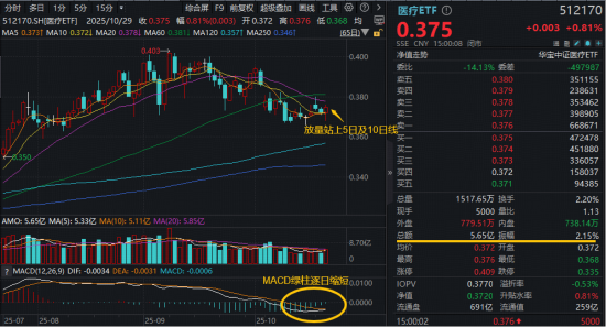 A股最大医疗ETF(512170)重仓医疗器械及CXO,午后翻红走高,场内收涨0.81%,全天成交5.65亿元,环比大增三成。技术面,512170今日放量站上5日及10日线,MACD绿柱逐日缩短,显示多头势力趋强。