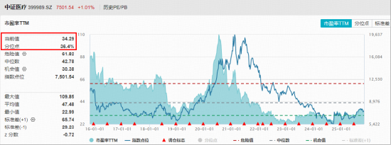 数据显示,医疗板块当前估值仍处于历史低位。医疗ETF(512170)标的指数中证医疗最新PE估值34.29倍,低于近10年60%以上时间区间。