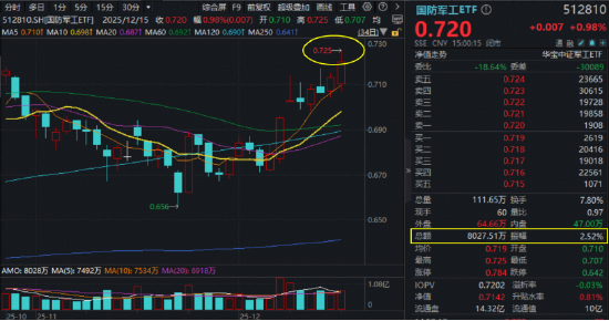 大市缩量调整,国防军工热度不减,商业航天、卫星互联网、大飞机、军工信息化等题材反复活跃。高人气国防军工ETF(512810)盘中上探1.54%创2个月新高,场内放量收涨0.98%,成交8028万元,12月以来日K呈显著向上趋势。