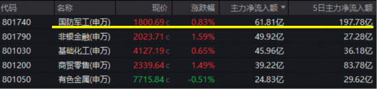 主力资金火速行动,集中追捧军工核心资产,今日国防军工行业主力净流入61.81亿元,在31个申万一级行业中高居首位,近5日累计吸金197.78亿元,同样高居第一。