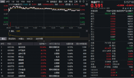 吃喝板块逆市上攻,反映吃喝板块整体走势的食品ETF(515710)全天高位震荡,盘中场内价格一度涨超1%,截至收盘,逆市涨0.68%。