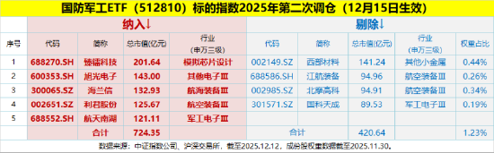 指数层面新动态,国防军工ETF(512810)标的指数中证军工2025年第二次调仓今日正式生效。此次调仓“5进4出”,调仓后成份股总数为80只。具体来看: