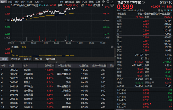 成份股方面,大众品涨幅居前,部分白酒股亦表现亮眼。截至发稿,安琪酵母大涨超5%,一鸣食品、新乳业、千禾味业涨超4%,桃李面包、迎驾贡酒跟涨超3%,贵州茅台、山西汾酒、洋河股份等亦小幅飘红。