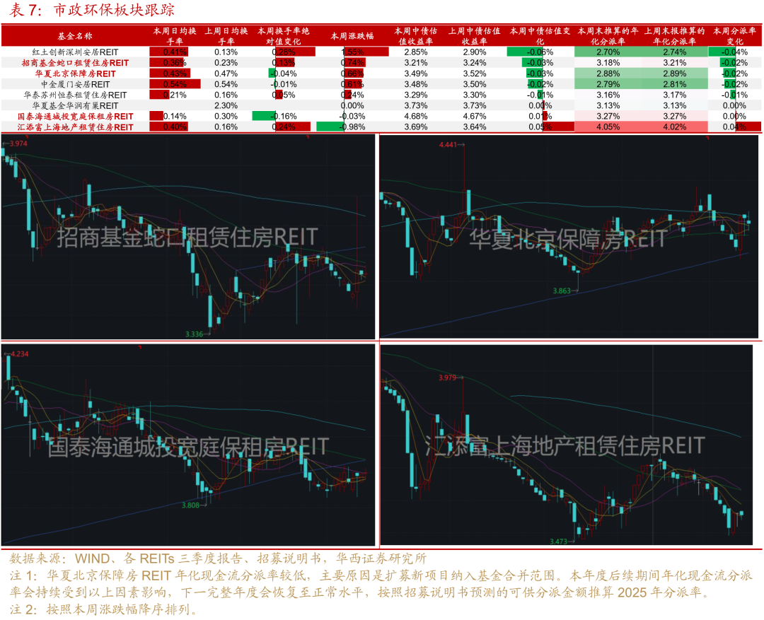 租赁住房板块本周收涨0.41%。上周提示关注的华夏北京保障房、招商基金蛇口租赁住房分派率分别为2.88%(高于深圳安居、厦门安居)、3.18%,本周下跌的汇添富上海地产、国泰海通城投宽庭分派率分别为4.05%和3.27%,下周均可重点关注。华润有巢向原持有人配售已完成,可关注配售弃购率及复牌后填权情况。