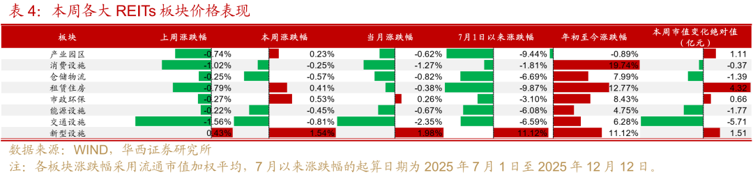 本周REITs板块表现有所分化,数据中心以1.54%涨幅大幅领先其他资产类型,交通设施跌幅最大达0.81%。