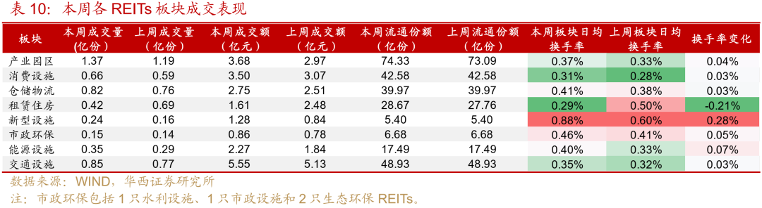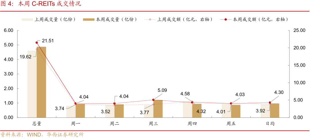 本周REITs成交活跃度边际提升但仍然较弱,日均成交额4.30亿元、日均成交量0.97亿份、日均换手率0.37%,环比分别上升9.65%、6.22%、0.02pct。