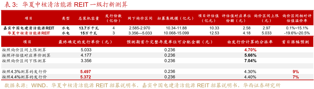 目前已上市的嘉实中国电建清洁能源REIT底层资产也为水电站项目,总装机容量13.7万千瓦,项目剩余期限34.27年,与中核清洁能源36年接近,可作为定价参照。