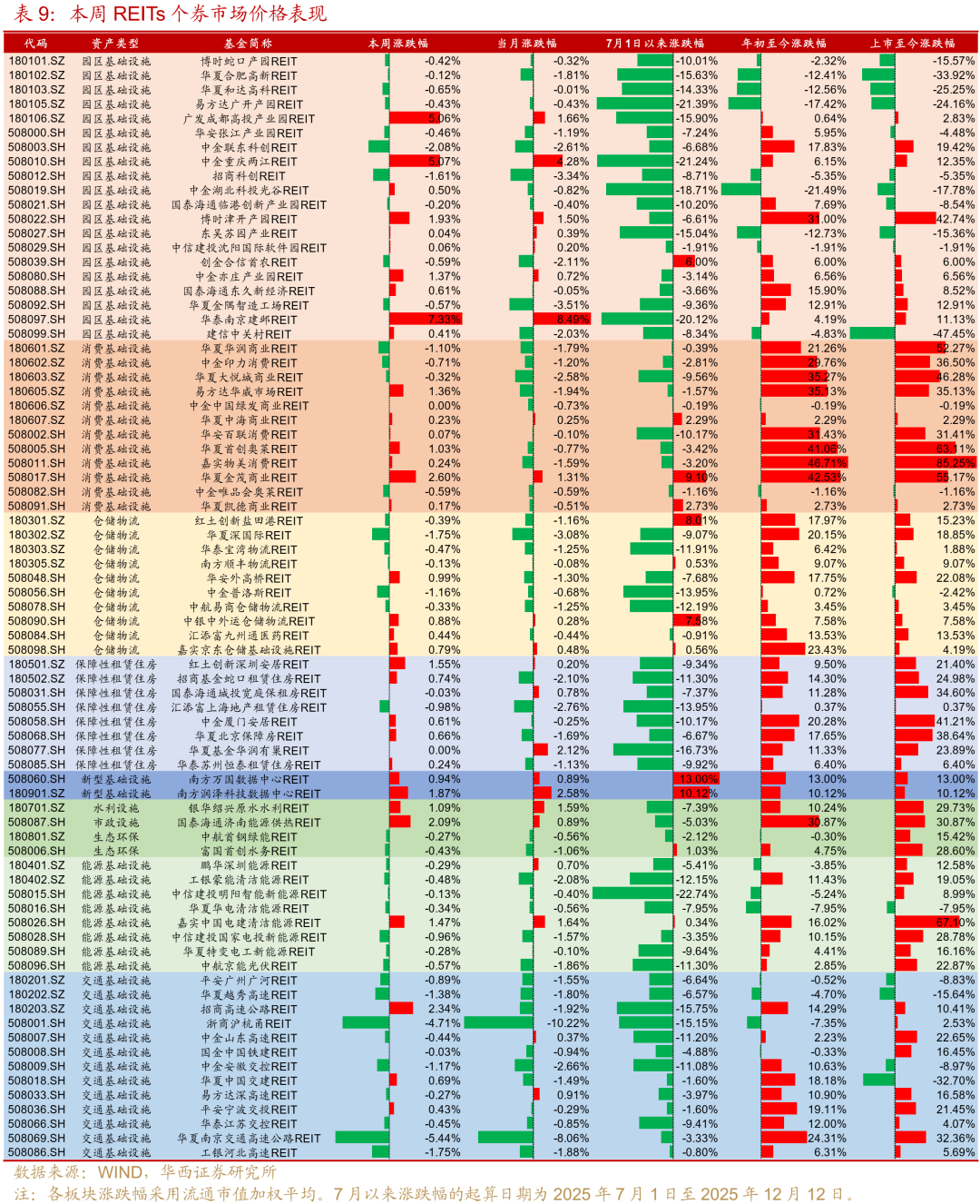 个券层面,本周涨幅较大的是华泰南京建邺(+7.33%)、中金重庆两江(+5.07%)和广发成都高投产业园(+5.06%)。跌幅较大的是华夏南京交通高速公路(-5.44%)、浙商沪杭甬(-4.71%)和中金联东科创(-2.08%)。
