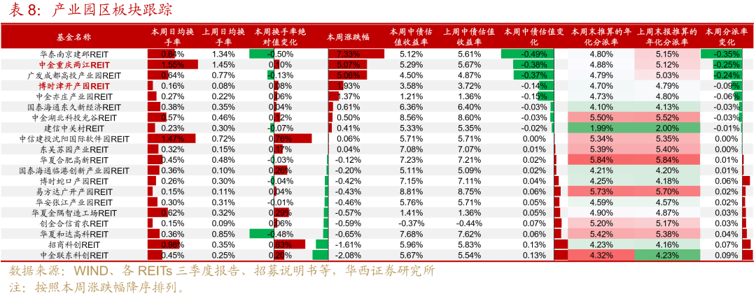 产业园区板块本周收涨0.23%,多个基本面相对欠佳、前期跌幅较大的个券强势反弹,但园区板块的去化压力仍在,对于高分派率个券仍需谨慎判断。