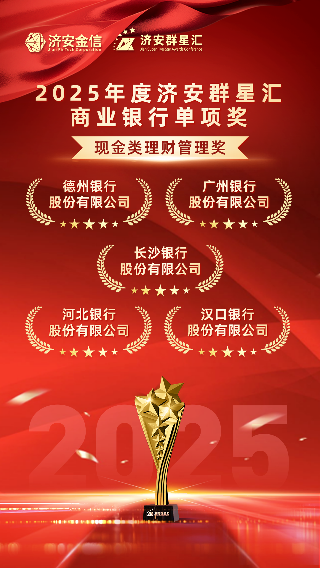 获得2025年度济安群星汇商业银行单项奖——现金类理财管理奖的机构是:长沙银行股份有限公司、德州银行股份有限公司、广州银行股份有限公司、汉口银行股份有限公司和河北银行股份有限公司。