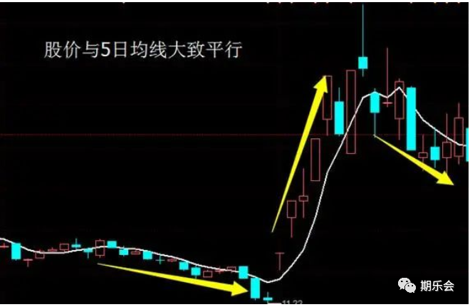 对于均线理论比较了解或者对于5日均线的用法比较了解的投资者都应该知道,短线一波急速拉升或下杀行情与5日均线的运行方向基本是一致的,股价与5日均线之间呈现出一种近乎平行的关系,这叫做强波贴短均!