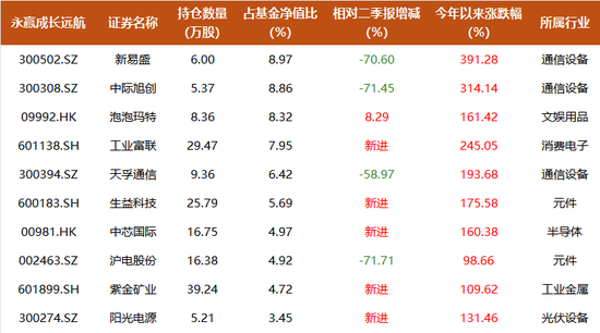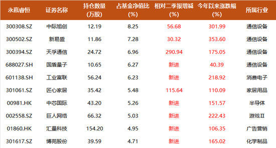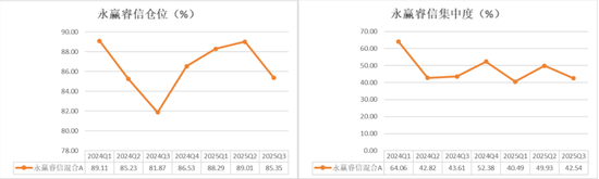 其中,永赢成长远航集中度最高,达64.28%;规模最大的永赢睿信则降至42.54%,持股进一步分散。