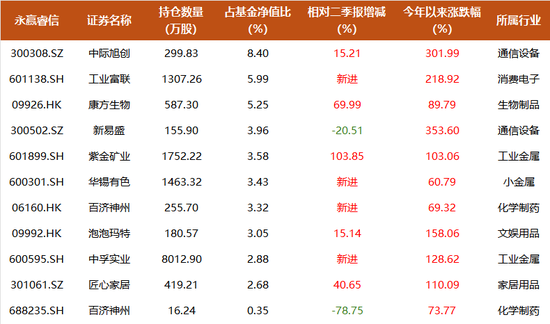 具体到个股层面,三季度新进的4只股票中有半数为有色金属相关标的,其中对紫金矿业进行了翻倍增持。