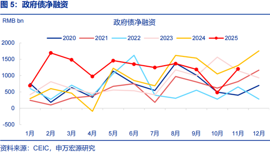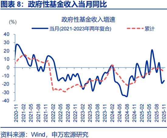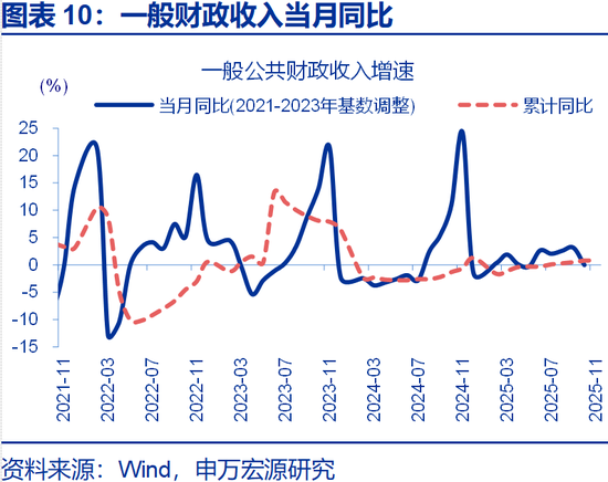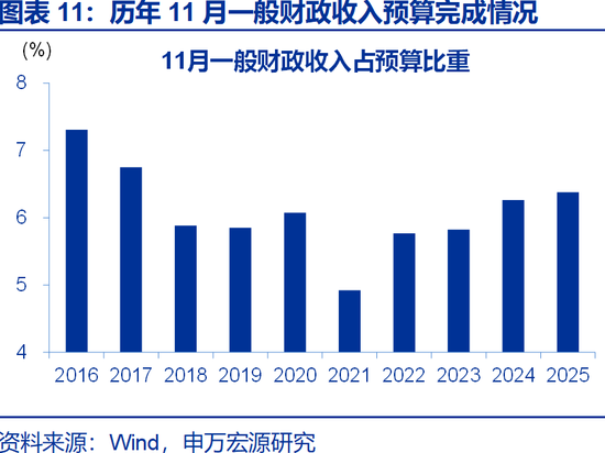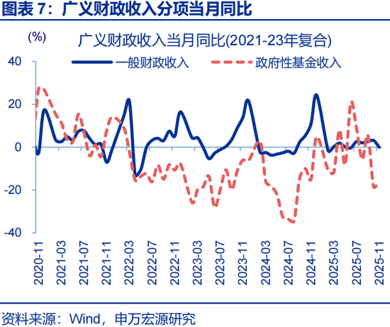 一般财政收入回落,拖累广义财政收入增速下滑。2025年11月广义财政收入同比-5.2%,较10月同比下降4.6个百分点;其中,政府性基金收入同比-15.8%,一般财政收入同比-0.02%。从预算完成度看,2025年11月广义财政收入预算完成7%,与2024年同期的7.1%以及过去五年平均的7%基本持平。