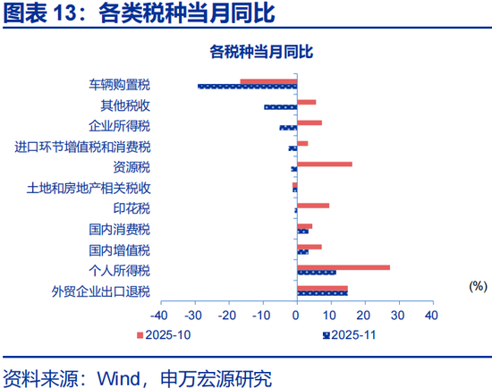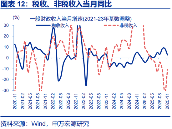 税收收入增速回落,非税收入延续负增长,拖累一般财政收入下滑。2025年11月,一般财政收入同比-0.02%,较10月下降近3.2个百分点;非税收入降幅明显收窄,11月同比-10.8%、较10月降幅收窄约22个百分点;税收收入增速小幅回落,11月同比2.8%,较10月增速下降5.8个百分点。11月,国内个人所得税、增值税、消费税均有回落,当月同比分别较10月下滑15.8个百分点、3.9个百分点、1.1个百分点,达11.4%、3.3%、3.3%;土地和房地产相关税收降幅小幅收窄,11月同比-1.3%。2025年11月一般财政收入预算完成6.4%,高于过去五年同期平均的5.8%。