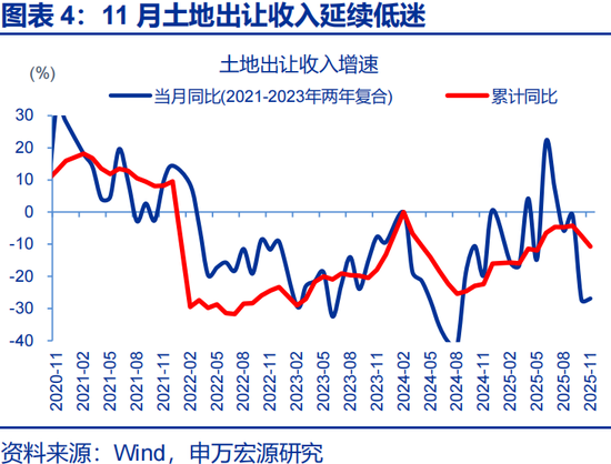 财政收支分化格局,部分缘于收入端基数扰动与土地财政持续拖累。基数角度看,2024年11月广义财政收入同比延续修复,当月同比11%,较10月大幅提升5.5个百分点,形成一定高基数压力。叠加2025年11月一般公共预算收入当月同比仅-0.02%(前值3.2%),收入端增速转弱进一步制约整体财力扩张空间。同时,土地财政低迷态势未改,11月地方国有土地使用权出让收入虽较10月降幅略有收窄,但当月增速仍处于负增长区间。