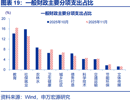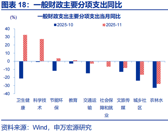 一般财政支出分项中,卫生健康、科学技术相关支出明显加快。2025年11月,一般财政支出同比-3.7%,较10月降幅收窄超6个百分点;支出分项中,卫生健康、科学技术相关支出明显加快,当月支出同比分别为32.5%、27.4%;基建类支出增速降幅收窄,城乡社区、农林水支出增速降幅较10月分别收窄7.4个百分点、4.8个百分点。从支出占比来看,教育、卫生健康支出占比明显提升,较10月分别提升2.3个百分点 、1.4个百分点。2025年11月一般财政支出预算完成度为7.6%,低于过去五年同期平均水平8%。
