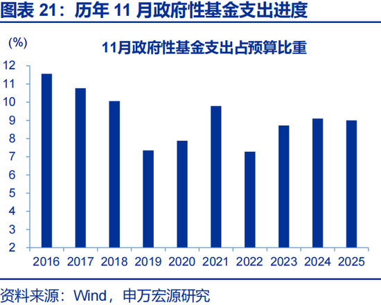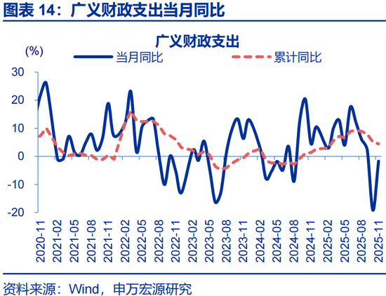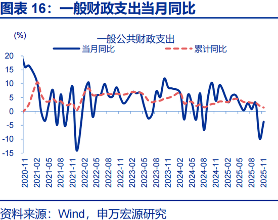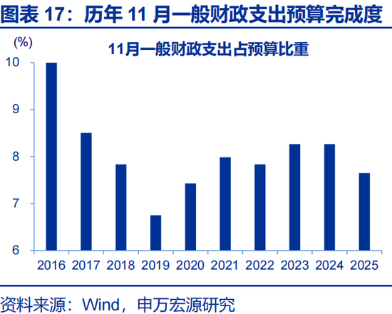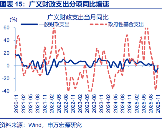 一般财政支出及政府性基金支出加快,推动广义财政支出降幅收窄。2025年11月,广义财政支出同比-1.7%,较10月降幅收窄17.5个百分点;一般财政支出同比-3.7 %,较10月降幅收窄超6个百分点;政府性基金支出同比达2.8 %,较10月支出增速提升41个百分点。2025年11月广义财政支出预算完成8%,低于过去五年平均支出进度8.4%。