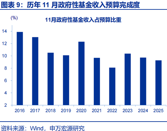 政府性基金收入降幅收窄,预算完成度低于过去五年同期平均水平。2025年11月,政府性基金收入同比- 15.8%,较10月降幅收窄2.6个百分点;其中,地方国有土地出让收入延续低迷,同比-26.8%,10月增速为-27.3%。2025年11月政府性基金收入预算完成度为9.3%,低于2024年同期的9.7%和过去五年同期平均10%。