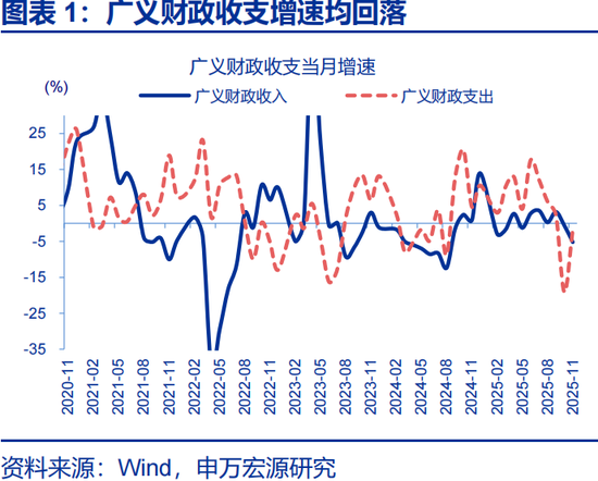 11月广义财政收支“支出改善、收入承压”的分化态势,支出进度较10月明显提速。11月,广义财政支出同比-1.7%,较10月降幅明显收窄17.5个百分点;广义财政收入同比-5.2%,较10月-0.6%进一步下滑4.6个百分点。从支出进度看,11月广义财政支出预算完成度回升至8%,较10月5.6%的明显提升,显现年末赶进度的发力特征。分项来看,一般财政支出同比-3.7%,较10月-9.8%降幅收窄6.1个百分点;政府性基金支出同比2.8%,较10月-38.2%实现由负转正,成为支出改善的重要支撑。