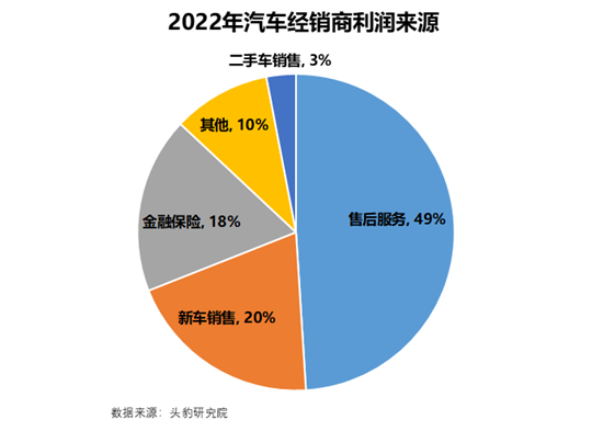 根据中国汽车流通协会和头豹研究院的数据,2022年汽车经销商主要的利润来源是售后服务,占接近一半,其次是新车销售和金融保险。问题是新能源汽车不怎么需要售后,传统燃油车年均维保费用大约在2600元左右,而新能源基本上是在这个基础至少打个五折。