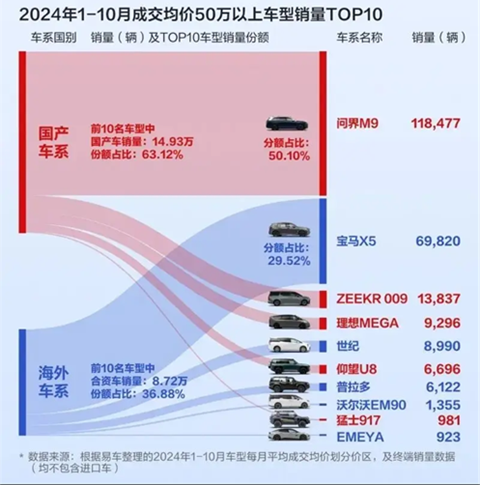 根据易车网的数据,2024年1-10月中国市场成交均价50万以上的车型中,问界M9以11.85万的销量,占据了超过50%的市场份额。