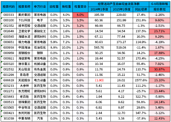 数据来源:Wind,中证指数公司,截至2025.9.15,其中旧权重为2025.9.15调仓前统计,6-8月涨跌幅统计区间:2025.6.1-2025.8.31。以上仅作为指数成分股展示,不作为个股推荐,指数成分股可能不定期调整,不代表本基金未来必然继续持有这些股票。