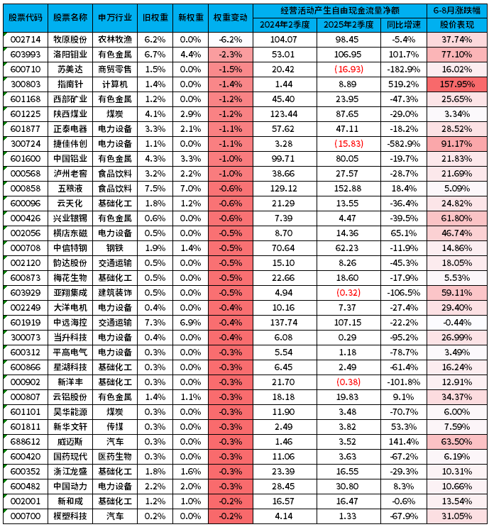 根据上表数据,我们做了一些统计,这33只个股2025年2季度的经营活动产生自由现金流量净额合计为939.39亿,相对于去年2季度的1132.18亿同比下降17.03%,这说明权重被明显调降的这33只个股边际基本面上有所走弱。此外,今年6-8月期间(也即中证现金流此次与上次调样的间隔期间),这33只个股平均上涨29.96%,明显优于同期中证现金流全收益指数13.08%的涨幅。一言以蔽之,中证现金流指数此次权重被明显调低的个股基本面边际走弱且近期涨幅较大。