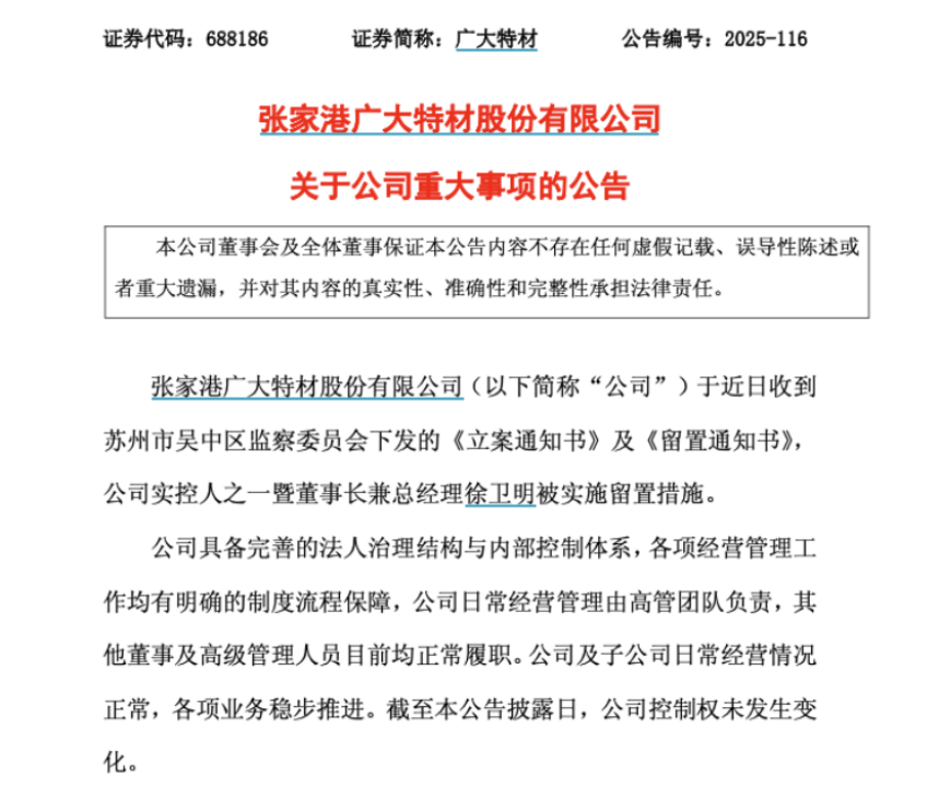 2025年10月14日晚,张家港广大特材股份有限公司(证券简称广大特材688186)公告,公司于近日收到苏州市吴中区监察委员会下发的《立案通知书》及《留置通知书》,公司实控人之一暨董事长兼总经理徐卫明被实施留置措施。