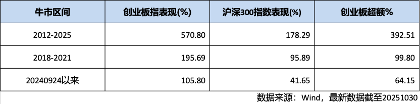 同时,回溯过去2009年后的每一轮行情起伏,创业板都是行情的热土。2012年到2015年的成长股行情里,创业板最大上涨幅度超过580%,约为同期沪深300指数最大涨幅(166%)的3.49倍;2018年到2021年的蓝筹股牛市里,创业板最大上涨幅度超过200%,亦是同期沪深300指数涨幅(43%)的4.65倍;而在本轮正在进行的大行情里,从2024年9月至2025年10月,创业板的最大涨幅亦达到了110%以上,也是同期沪深300指数涨幅(51%)的2.16倍。创业板创新、成长的属性,是这些热烈市场表现背后的关键动力。