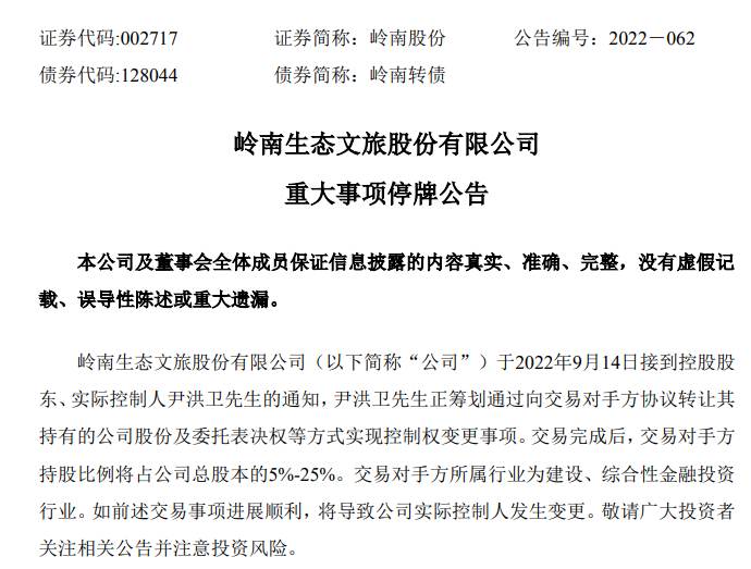 2022年年初,岭南股份为缓解资金压力有意引入战略投资者。2022年4月7日岭南股份与华盈投资公司达成初步收购意向,并开始推进华盈投资收购岭南股份股权和控制权事宜。