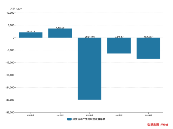 此外,公司经营活动现金流净额也连续三年为负,2022-2024年累计净流出4.77亿元,相当于同期营收的18%。
