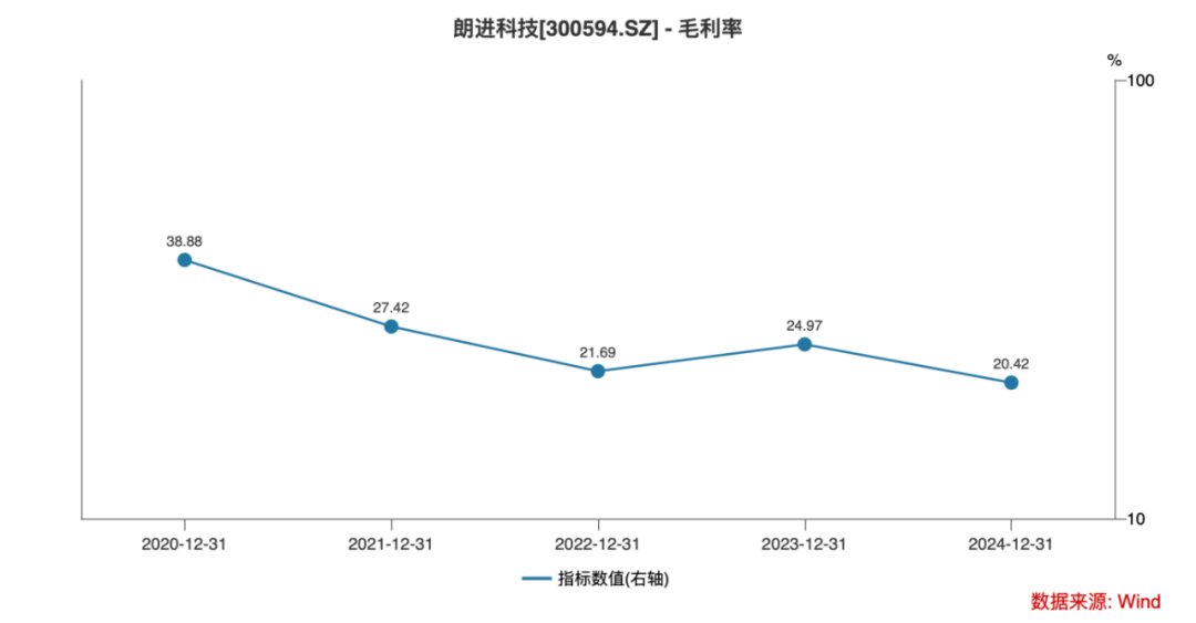 2020年开始,虽然朗进科技营收体量有所增长,但是毛利率水平大幅下滑,从2020年的38.88%一路跌落至2024年的20.42%,跌幅达18.46个百分点。